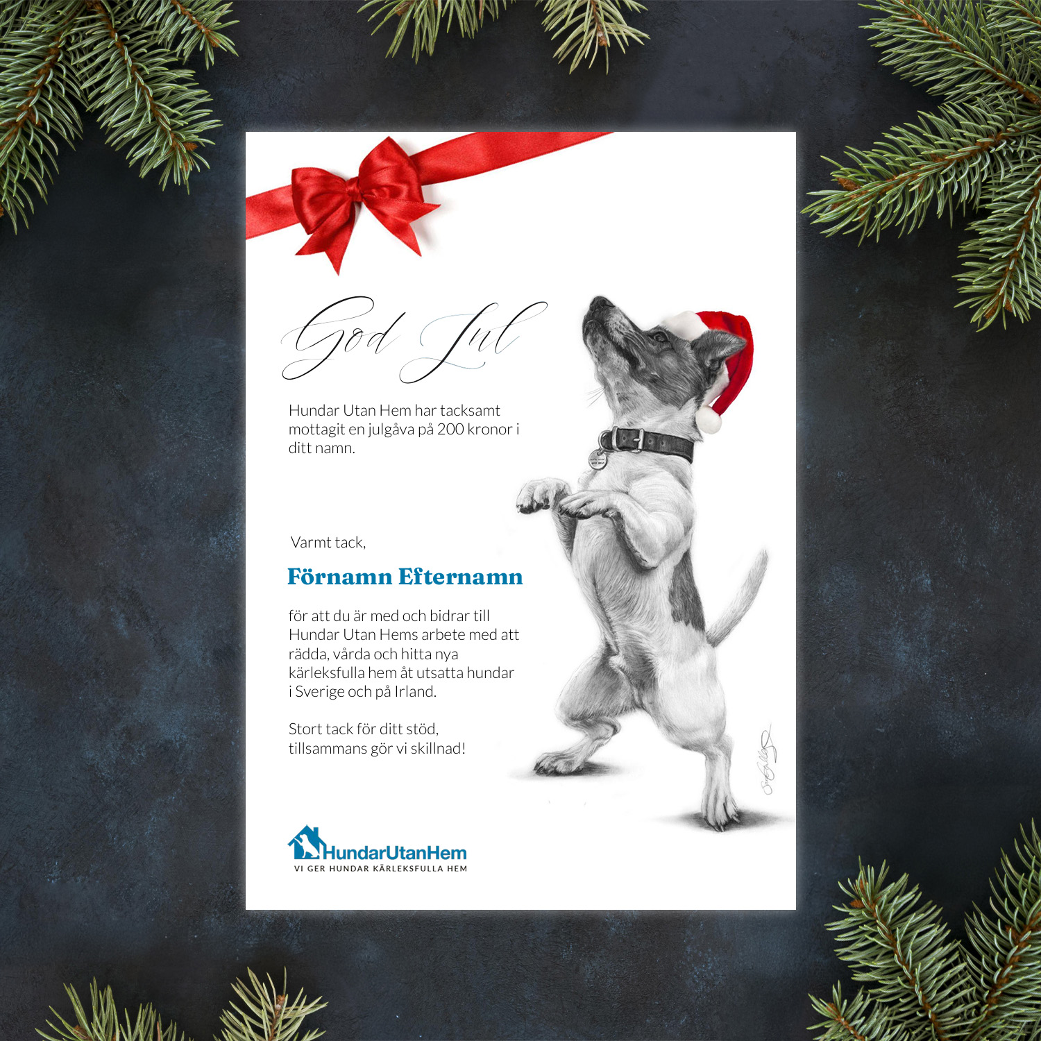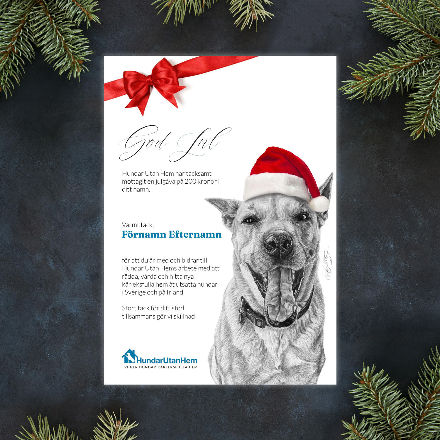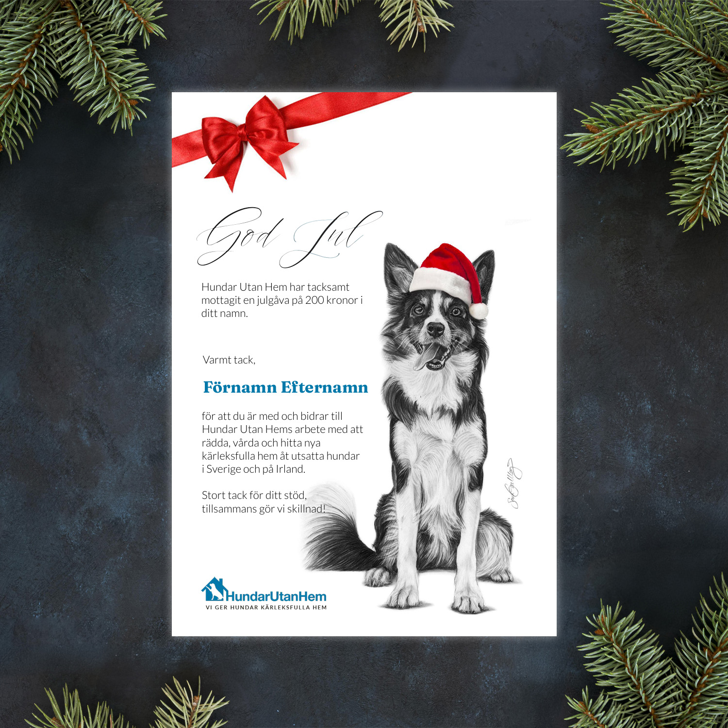 Hundar Utan Hems digitala gåvobevis med jul-tema är en perfekt julklapp till hundmänniskan eller någon du tycker om. När du köper ett digitalt gåvobevis stödjer du Hundar Utan Hems arbete med utsatta hundar. Dessa fina gåvobevis har tagits fram i samarbete med Art For Animals.