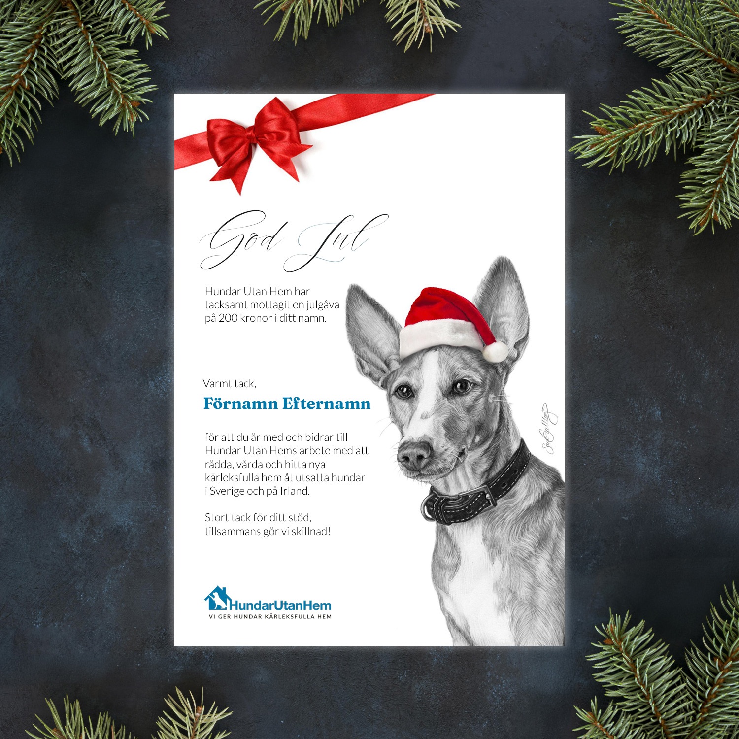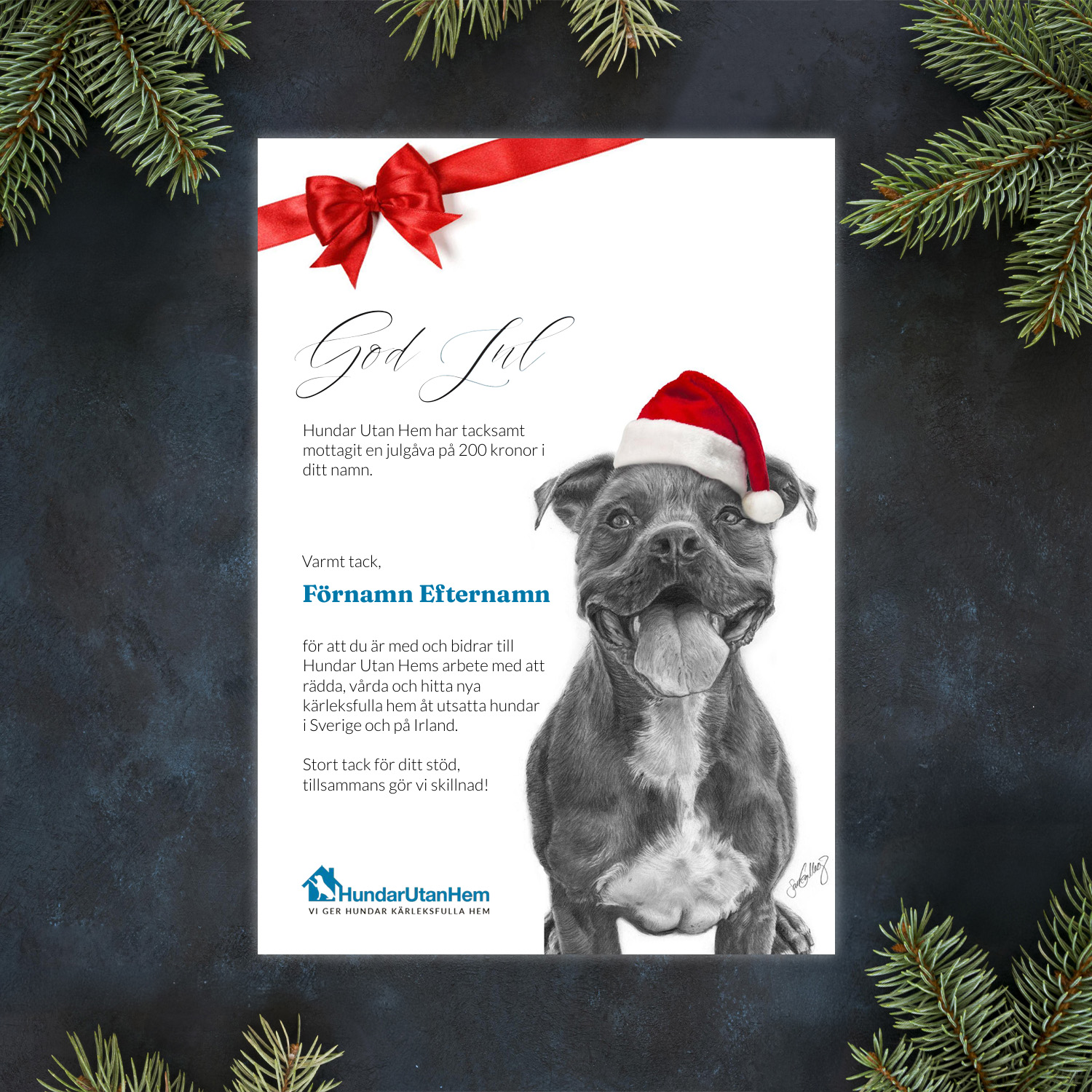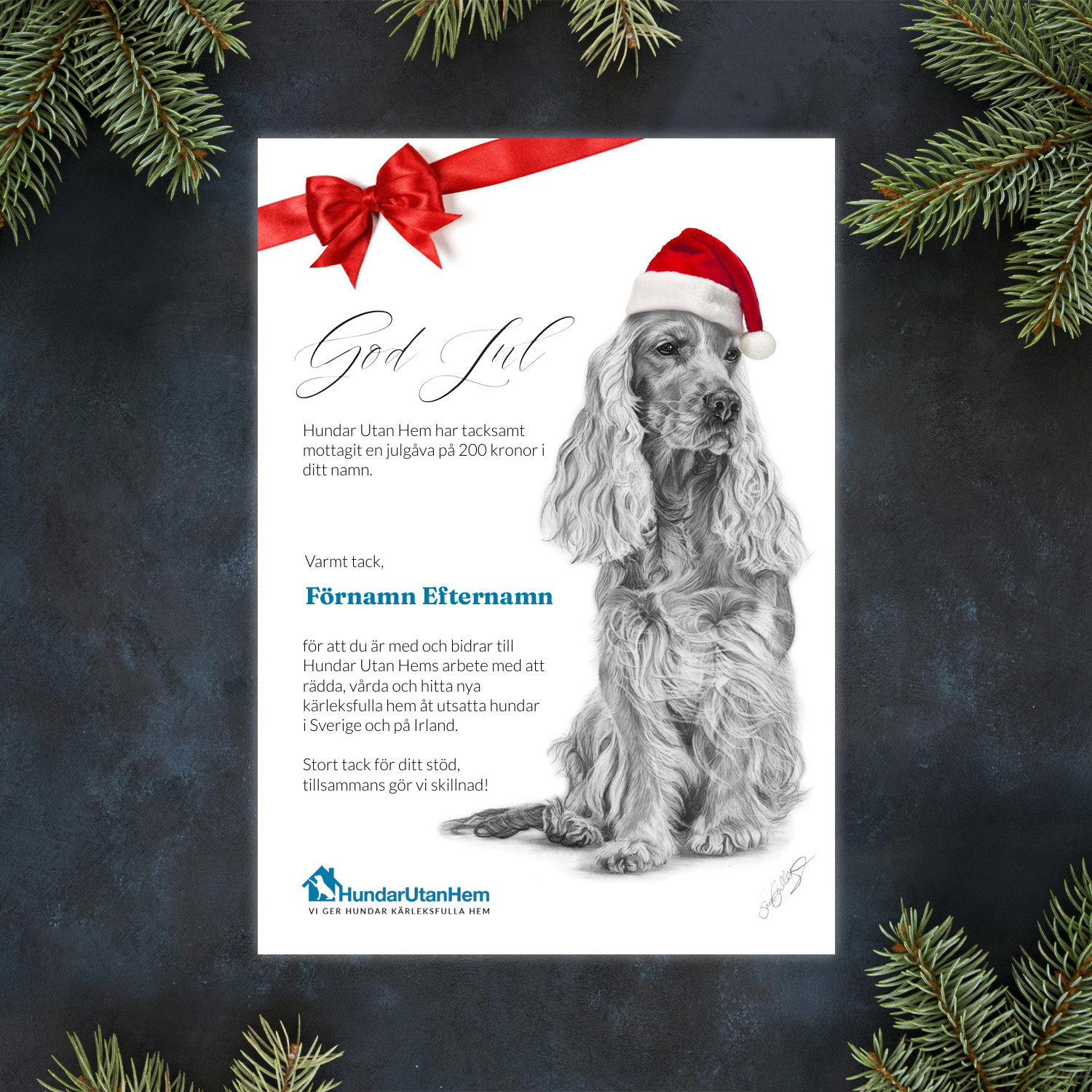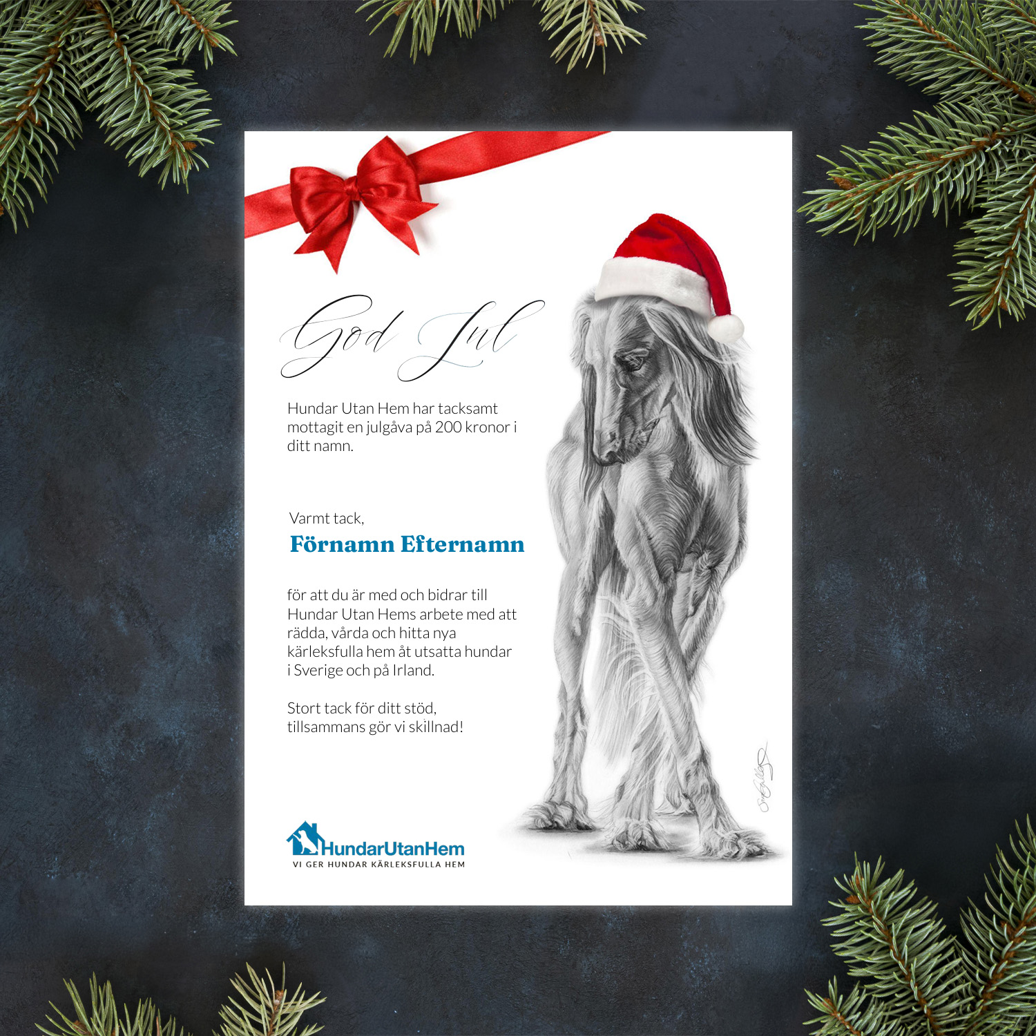 Hundar Utan Hems digitala gåvobevis med jul-tema är en perfekt julklapp till hundmänniskan eller någon du tycker om. När du köper ett digitalt gåvobevis stödjer du Hundar Utan Hems arbete med utsatta hundar. Dessa fina gåvobevis har tagits fram i samarbete med Art For Animals.